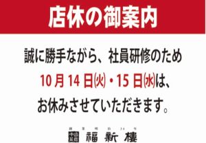 10 102025 店休日のご案内 誠に勝手ながら、社員研修のため10月14日(火)・15日(水)はお休みさせていただきます。 Tweet Share 自宅で福新楼「雲吞湯(ワンタンスープ)のショート動画レシピ」 前の記事